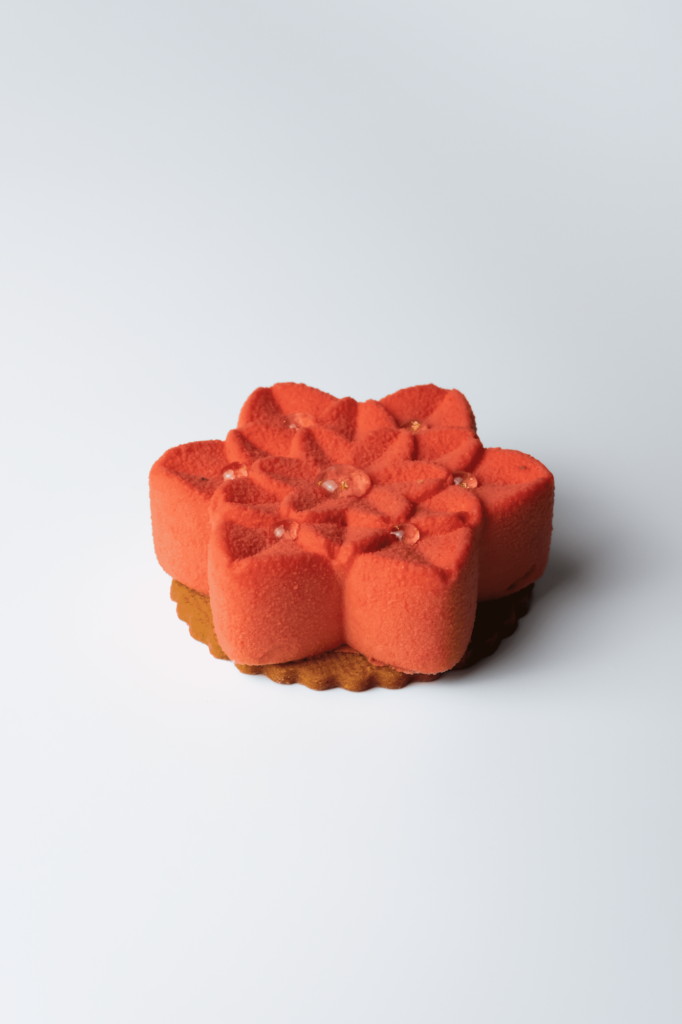 Biscuit caramel, crémeux chocolat caramel, caramel onctueux, croustillant riz soufflé, mousse chocolat noir 66%.