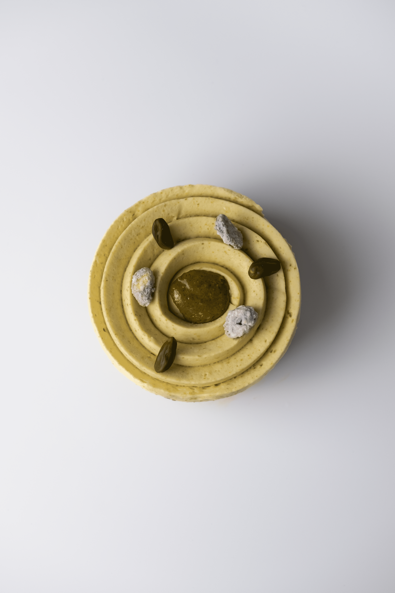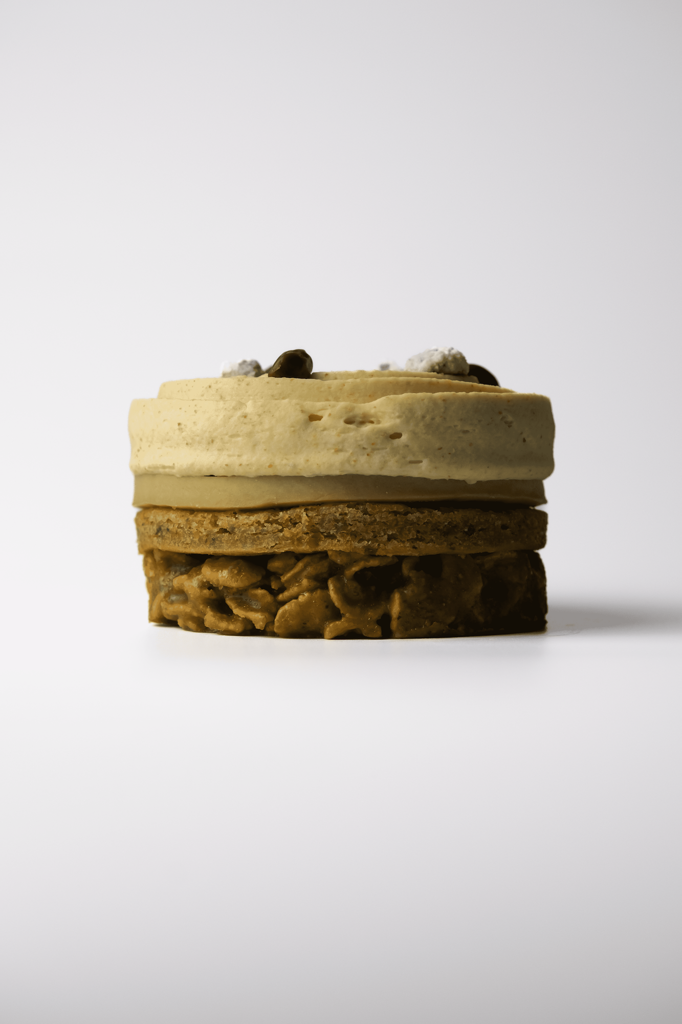 Croustillant pétale de maïs et praliné pistache, biscuit pistache, crémeux pistache - fleur d’orange et ganache montée pistache grillée.