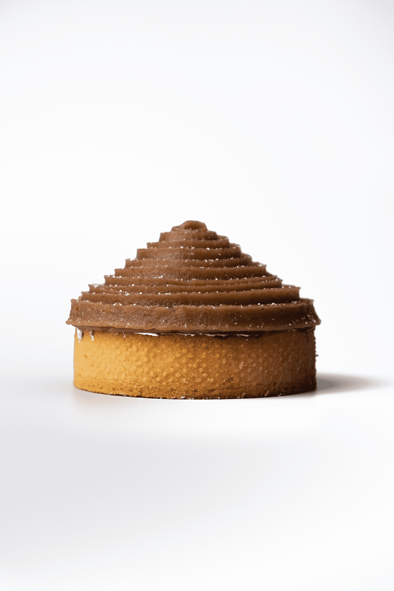 Fond pâte sablé à base de crème d’amande et éclats de marron, compotée de cassis, crème légère à la vanille et pate de marron.